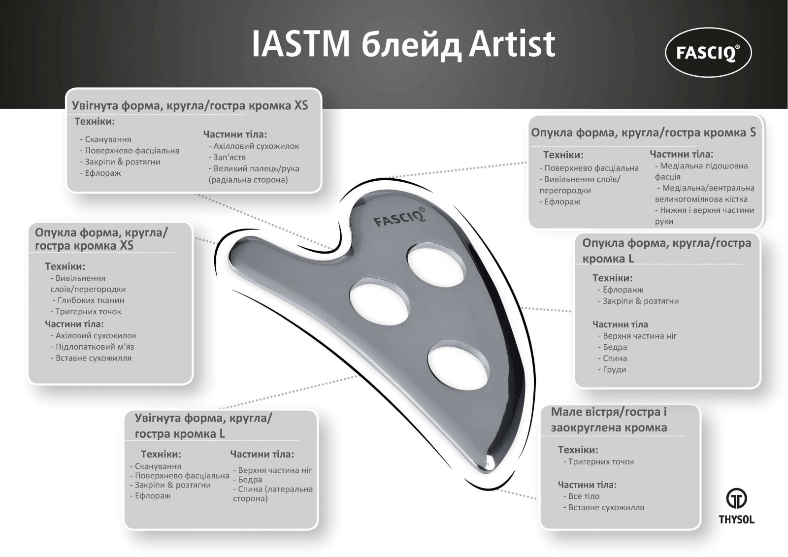 Масивний міцний інструмент з плоскою нижньою кромкою і скошеним краєм зверху, ідеально підходить для діагностики тканини. Блейд також має різні сторони і форми, такі як увігнута, опукла і гостра, що робить його універсальним інструментом IASTM (інструментальна мобілізація м'яких тканин).