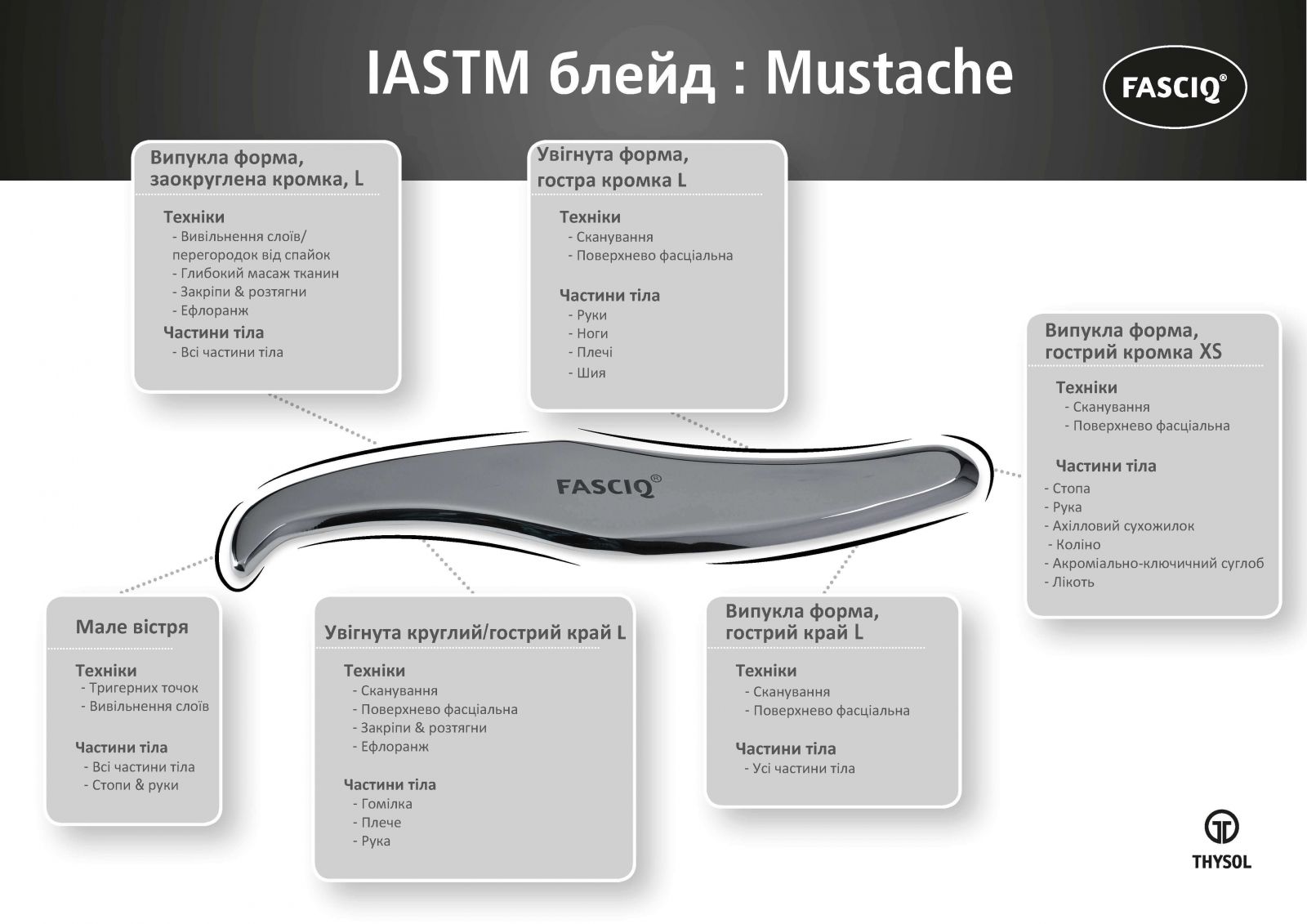 S-подібний блейд IASTM Mustache має широкий спектр використання, зручний для маніпуляцій. В інструмента пряма обробку знизу, а зверху-кругла та скошена кромка. Вістря на одному з кінців призначене для досягнення глибоких фасціальних шарів. Універсальний блейд для загального використання.
